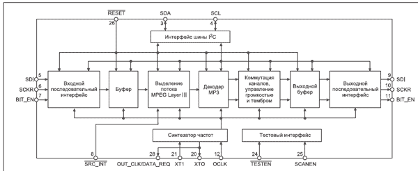 Вычислительное ядро микросхемы представляет собой высокопроизводительный цифровой сигнальный процессор (DSP), обеспечивающий декодирование звукового потока формата МРЗ, цифровую фильтрацию сигнала, а также управление модулем синхронизации микросхемы.