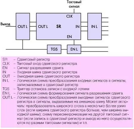 Весьма полезным средством отладки устройства, реализованного на ПЛИС, может оказаться логический анализатор, размещенный внутри этой ПЛИС. Возможность такого размещения, как правило, имеется, поскольку логические ресурсы ПЛИС очень редко задействованы полностью. Обычно часть их остается свободной, и этой части достаточно для реализации логического анализатора. Такой анализатор имеет доступ ко всем логическим сигналам - как к внешним, поступающим на выводы ПЛИС, так и к внутренним, не поступающим на ее внешние выводы. Анализатор позволяет запоминать последовательность сигналов или их комбинаций в сдвиговом регистре, организованном в ПЛИС на одном или нескольких блоках памяти (см. рисунок). Причем запись может вестись как в каждом такте, так и по условию, выработанному на основе логических сигналов ПЛИС. Запись останавливается (по достижении ошибки) либо по условию, выработанному внутри ПЛИС, либо по внешнему сигналу, поступающему, например, от тестового оборудования. После этого сдвиговый регистр хранит информацию и о сигналах на момент проявления ошибки, и о сигналах за предыдущее время (предистория). Считав эти данные, можно получить информацию о непосредственном проявлении ошибки и о том, что ей предшествовало. Анализ этой информации, как правило, позволяет выявить характер ошибки и определить пути ее исправления. Важное достоинство такого логического анализатора - большая гибкость. Можно выбирать как ширину записываемой информации (число записываемых в одном такте бит), так и ее глубину (глубину сдвигового регистра). Разработчик свободен в выборе того, какие биты или их логические комбинации записывать, каковы условия записи и ее останова.