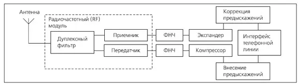 Радиоудлинитель состоит из абонентского блока, устанавливаемого у абонента, и базового блока, устанавливаемого на телефонной станции (или в любом другом месте, где есть телефонная линия). Типовая структурная схема каждого из блоков представлена на рис. 1. Предполагается, что выходом приемника является выход демодулятора (частотного дискриминатора), а входом передатчика - вход частотного модулятора. Каждый блок представляет собой дуплексную радиостанцию, подключенную к соответствующему интерфейсу линии. В базовом блоке интерфейс эмулирует телефонный аппарат, а в абонентском - абонентский комплект АТС. В связи с повышенными требованиями к качеству звукового сигнала по сравнению с радиостанциями, в низкочастотном тракте, как правило, применяются комплементарные схемы шумопонижения (пара компрессор-экспандер).