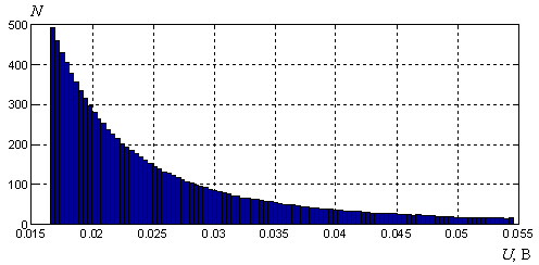 Определим одномерную плотность распределения формируемых ШХС, произведя статистическое усреднение сигналов по времени. Исследование будем проводить для непрерывнозначных ШХС длиной N = 10000, предварительно сделав следующее замечание. Для быстрого спада статистических связей более важную роль играют задержка в цепи ОС либо ее фазовая нелинейность, а вот амплитудная нелинейность, т.е. вид нелинейной функции в цепи ОС, напрямую влияет на распределение мгновенных значений ШХС на выходе генератора. Например, цепь ОС описывается уравнением