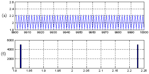 При a = 2,3 наблюдается устойчивое колебание между двумя точками (рис.12 (а), показаны последние 100 точек) и гистограмма имеет вид δ-функций (рис.12 (б)).