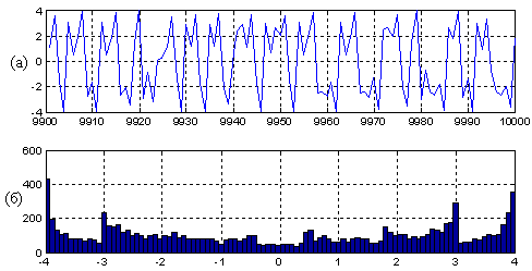 Рис.13. a = 4. Сигнал в установившемся режиме (а) и его гистограмма (б)