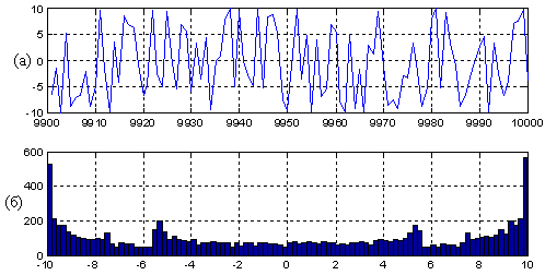 Следует сразу отметить принципиальную нереализуемость “чистого” хаоса с помощью ПК в связи с дискретностью представления чисел, т.е. неконтинуальностью значений процесса в ходе его вычисления машиной. Поэтому даже если обработка ведется с самой высокой в системе “MATLAB” точностью, – т.н. системная переменная eps = 2 -52 ≈ 2,2204∙10 -16, – то выходной процесс будет иметь пусть и чрезвычайно длительный, но тем не менее характеризуемый некоторым числом период. Однако по причине огромного периода повторения можно допустить, что на интервале наблюдения процесс непериодичен и в дальнейшем речь будет идти о формировании именно непрерывнозначного и непериодического хаоса.