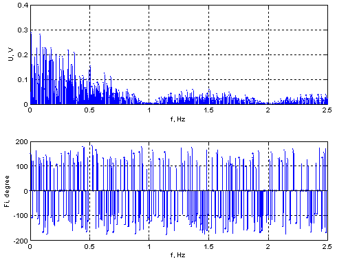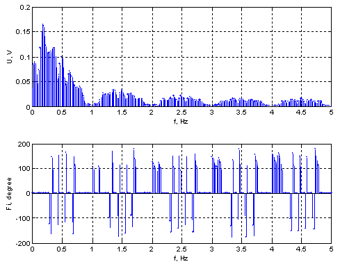 При расчете спектра условно приняты такие же единицы измерения, как и при расчете АКФ: напряжение – вольты; время – секунды. Длительность элементарного импульса ШХС τ0 = 1 c.