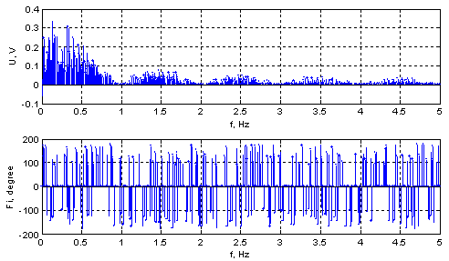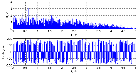 Как видим и амплитудный и фазовый спектры крайне изрезаны и непредсказуемы (особенно при больших N). Единственный минус – это четко выраженные минимумы амплитудного спектра, вызванные дискретностью смены значений ШХС. При переходе к непрерывному хаосу этот недостаток исчезает (рис. 8) и амплитудный спектр практически равномерен в широкой полосе частот.