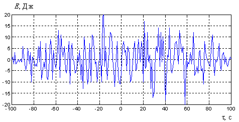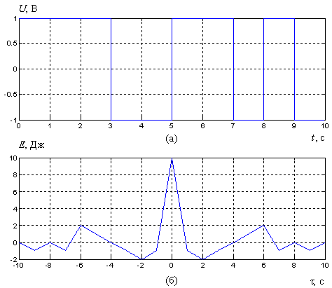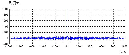 Минимальное значение АКФ rmin = - 2 Дж наблюдается при сдвиге τ = 2 c, максимальное – rmax = 2 Дж при сдвиге τ = 6 c. Энергия последовательности – 10 Дж. Пик-фактор