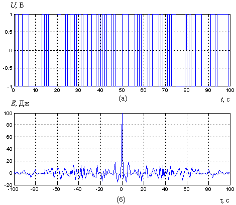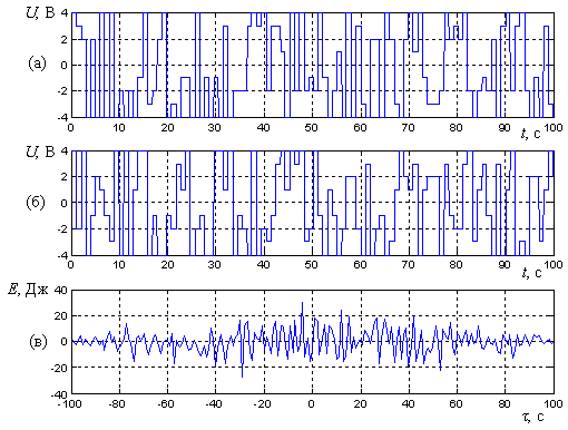 Как видим, при небольшом изменении начальных условий формирователя он порождает совершенно иной, некоррелированный с первым, процесс. Взаимная энергия процессов не превышает 20 Дж, следовательно пик-фактор для ВКФ двух бинарных ШХС равен двум и, как показывает моделирование, при изменении начальных условий не превышает трех–трех с половиной; для сравнения пик-фактор ВКФ М-последовательностей достигает пяти и выше (см. [3]). О хороших взаимокорреляционных свойствах последовательностей, формируемых системами с нелинейной динамикой, можно судить и по АКФ: разные сегменты одной и той же последовательности слабокоррелированы, следовательно, их также можно принять в качестве сигналов-переносчиков информации в СПИ.