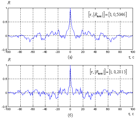Рис.6. Нормированная АКФ бинарных ШХС с N = 100 при прореживании “один из трех” (а) и “один из восьми” (б)