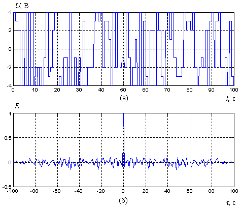 Рис.8. Реализация 8-уровневой хаотической последовательности (а) и ее нормированная АКФ (б)