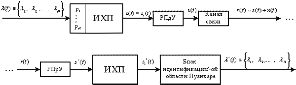 Опережающее управление сечением Пуанкаре (рис. 4). В этом виде модуляции для кодирования и декодирования используется символический анализ [21]. В сечении Пуанкаре аналоговой хаотической системы идентифицируются две или более разделенные области и им присваиваются определенные значения для кодирования информации (например, одной траектории хаос-процесса условно присваивается "0", другой - "1"). С помощью соответствующего метода управления фазовая траектория передающей системы направляется через одну из областей сечения Пуанкаре так, что реализуются траектории, соответствующие информационному сигналу, который должен быть передан. Управление можно осуществить, например, изменяя в незначительных пределах один из параметров р стохастической автоколебательной системы в соответствии с передаваемым символом из алфавита сообщения λ.