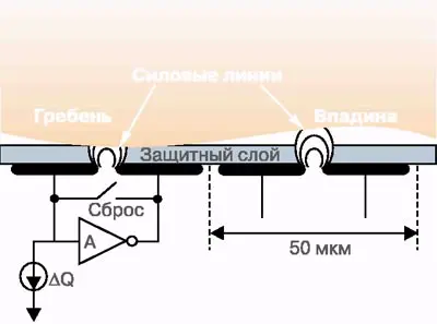 Существует два основных способа емкостного сканирования - пассивный и активный. Оба основаны на заряде и разряде конденсаторов в зависимости от расстояния до кожи пальца в каждой отдельной точке поля и считывании соответствующего значения. Это возможно, поскольку размеры гребней и впадин на коже достаточно велики. Средняя ширина гребня - около 450 мкм. Сравнительно небольшой размер конденсаторных модулей (50 х 50 мкм) позволяет замечать и фиксировать различия емкости даже на близких точках кожи.