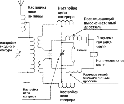 До настоящего времени неясно, какой приемник использовал Маркони на приемной станции в Канаде. Известно, что Маркони первоначально хотел использовать для приема сигналов в St. John's приемник с настроенными входными цепями. Схема этого приемника, запатентованного Маркони (патент Великобритании №7777 от 26 апреля 1900 г.), показана на рис.2.