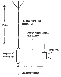 Предполагаемая схема приемника Маркони, используемая им для трансатлантической связи, представлена на рис.4. Внимательно рассмотрим ее. На схеме показаны: четвертьволновая антенна, являющаяся резонансной для принимаемого сигнала, ртутный когерер, наушники, аккумуляторная батарея. Рассчитывая использовать полуволновую резонансную антенну для длины волны 300 м, Маркони случайно использовал четвертьволновую резонансную антенну для действительной частоты работы передатчика. В самом деле, длина волны для частоты 511 кГц составляет 587 м, а четверть длины волны -147 м, что очень близко к длине используемой Маркони антенны.