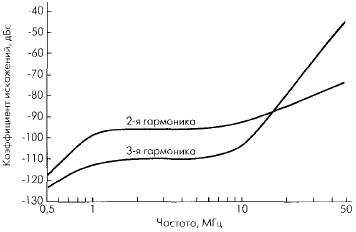 Рис. 1. Зависимость коэффициента искажений ОУ типа AD8099 от частоты
