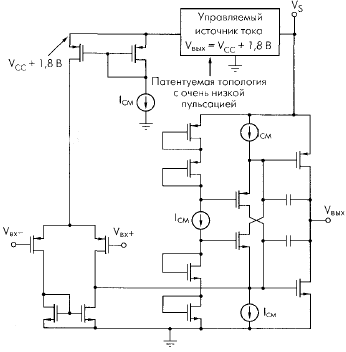 В 2002 году фирма Texas Instruments выпустила семейство высокопроизводительных КМОП-микросхем ОУ, работающих с однополярным источником питания на низкое напряжение: 1,8 (+0,9) - 5,5 (±2,75) В. К достоинствам этих миниатюрных ОУ семейства ОРА363/364 относится низкий коэффициент ослабления синфазного сигнала (типичное значение -90 дБ). Это достигнуто благодаря модификации однокаскадного rail-to-rail входного блока ОУ с управляемым источником тока (рис.2). Максимальное значение напряжения смещения нуля микросхем семейства равно 500 мкВ, рабочий ток -750 мкА/канал. Предусмотрена возможность отключения выхода усилителя, при этом потребляемый ток не превышает 1 мкА/канал. Скорость нарастания выходного сигнала составляет 5 В/мкс.