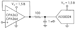 ОУ семейства предназначены в основном для управления АЦП со средним быстродействием (до 100 кГц), таких как 14-бит ADS8324, работающий от источника питания на напряжение 1,8 В и выполняющий 50 Квыборок/с (рис.3).