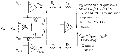 Нельзя не упомянуть микросхемы ОУ с rail-to-rail входом и выходом типа МАХ 4194/4197 фирмы Maxim Integrated Products. Эти усилители отличаются высокой точностью и широкой полосой пропускания (250 кГц на уровне 3 дБ для МАХ 4194). Ослабление синфазного сигнала составляет 115 дБ. МАХ 4194 имеет регулируемый коэффициент усиления, остальные усилители серии поставляются с фиксированным усилением. При этом в последних трех ОУ предусмотрена возможность переключения в режим отключения выхода, при котором ток потребления составляет 8 мкА (в рабочем режиме ток потребления всех микросхем серии - 93 мкА). Работают ОУ от однополярного источника питания на напряжение 2,7-7,5 В или от двухполярного на ±(1,35-3,75) В. Размах rail-to-rail входов и выходов может достигать от 200 мВ ниже отрицательной шины до 1,1 В положительной шины. Для получения высокой точности по постоянному току ОУ серии включаются по традиционной трехусилительной схеме (рис.4). Поставляются микросхемы в восьмивыводном корпусе SO по цене 1,69 долл. при закупке 1 тыс. штук.