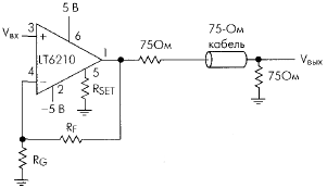 Современные микросхемы ОУ, помимо традиционной биполярной технологии, выполняются по КМОП-, БиКМОП-, комплементарной биполярной (КБ), кремний-германиевой и арсенидгаллиевой технологиям, причем, как и во всей микроэлектронике, предпочтение отдается КМОП-схемам. Правда, сегодня КМОП-технология уже не обеспечивает требуемые в некоторых применениях точность и размах напряжения. Более того, большая емкость затвора больших МОП-транзисторов может вызвать проблемы, связанные со стабильностью работы или рассеиваемой мощностью. С другой стороны, КБ-микросхемы превосходят КМОП-устройства по сочетанию таких параметров, как частотная стабильность, малые искажения и рассеиваемая мощность. Высокое пробивное напряжение быстродействующих биполярных транзисторов позволяет создавать КБ-микросхемы драйверов с большим перепадом выходного напряжения. Вот почему около 70% современных ОУ с rail-to-rail архитектурой выполнены по комплементарной биполярной технологии. Так, КБ-микросхемы ОУ с обратной связью по току и rail-to-rail выходом типа LT6210 фирмы Linear Technology отличаются впечатляющими характеристиками, в том числе возможностью регулировки тока потребления в пределах от 300 мкА до 6 мА в зависимости от ширины полосы, изменяемой в пределах 10-200 МГц (рис.5). Для установления нужного значения тока потребления достаточен один резистор или источник тока. Это облегчает выбор оптимального соотношения быстродействие-потребляемая мощность для конкретного проекта. Благодаря сочетанию малой потребляемой мощности, высокого быстродействия, малых уровней шума (6,5 нВ/√Гц) и нелинейных искажений (-70 дБ на 1 МГц) LT6210 перспективен для применения в самом разнообразном оборудовании - от портативного до быстродействующих систем передачи данных. Скорость нарастания выходного напряжения ОУ составляет 700 В/мкс, время установления - 20 не. Работает микросхема от однополярного источника питания на напряжение 3-12 В или от двухполярного источника на ±( 1,5 - 6) В. Поставляется в шестивыводном корпусе типа ThinSOT по цене 1,2 долл. при закупке партии в 1 тыс. штук.