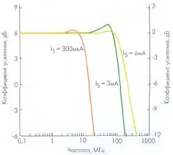 Рис . 5.б Зависимость усиления от частоты на малом сигнале при различных значениях тока потребления