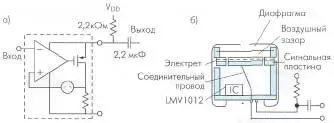 Рис. 7. Принципиальная схема ОУ для встроенного микрофона (а) и встраиваемого электретного микрофона (б)