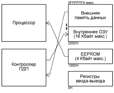 Следует напомнить, что в микроконтроллерах имеется память двух видов: память программ (часто называемая FLASH-памятью) и память данных. Память программ не относится к общим ресурсам, так как доступна только процессору. Поэтому в дальнейшем будем рассматривать только память данных, доступную как процессору, так и контроллеру ПДП.
