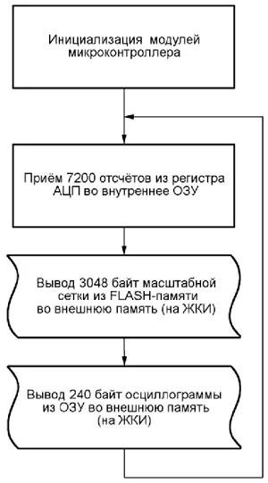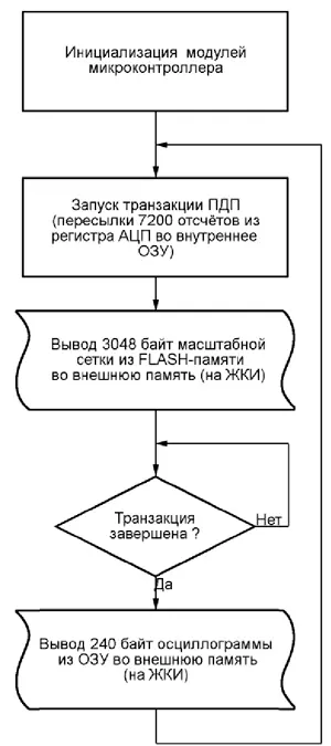 Рассмотрим практическое использование ПДП на примере программы микроконтроллера цифрового осциллографа. В ходе приёма информации от АЦП и её отображения на ЖКИ циклически выполняются следующие действия: