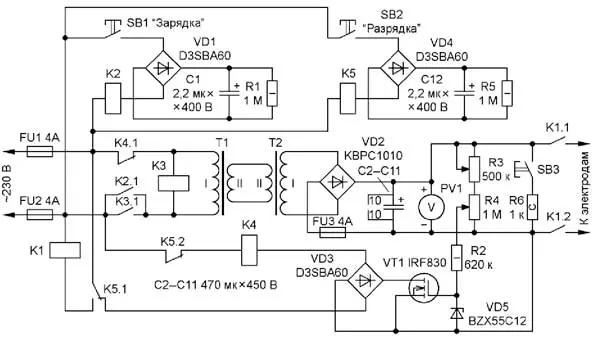 Схема устройства показана на рис. 1. Прибор содержит три основных функциональных узла: узел накопительных конденсаторов (конденсаторы С2- С11, трансформаторы Т1, T2, диодный мост VD2), узел установки рабочего напряжения (диодные мосты VD1 и VD3, транзистор VT1, кнопка "Зарядка" SB1 (зелёная кнопка), переменные резисторы для грубой (R4) и точной (R3) установки напряжения зарядки конденсаторов, вольтметр PV1, кнопка SB3 (жёлтая кнопка), резистор R2 и ограничительный стабилитрон VD5), узел запуска (кнопка "Разрядка" SB2 (красная кнопка), диодный мост VD4, C12, R5, реле K5, контактор К1). Прибор защищён плавкими вставками FU1-FU3.