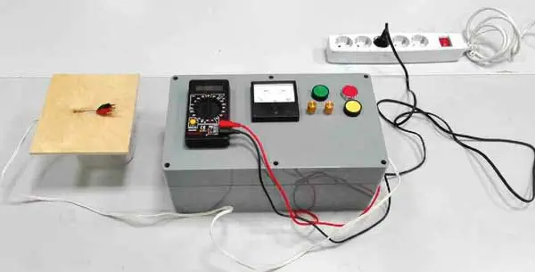 Далее переменными резисторами грубой (R4) и точной (R3) установок начального напряжения задают требуемые условия разрядки. Нажатием на красную кнопку (SB2) производят разрядку батареи конденсаторов и затем измеряют конечное напряжение. Начальное и конечное напряжение измеряют стрелочным вольтметром, встроенным в корпус прибора, и цифровым, вынесенным наружу. Жёлтая кнопка (SB3) позволяет проводить полную или частичную разрядку батареи конденсаторов замыканием через резистор R6. Нажатие на зелёную кнопку (SB1) восстанавливает первоначально установленное напряжение, и прибор вновь готов к проведению эксперимента.