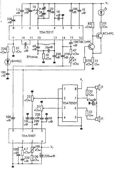 Однако главная проблема УКВ-приемника - необходимость обеспечить его низкую стоимость, поскольку технически все перечисленные трудности вполне разрешимы. Собственно, это проблема всей бытовой техники, и решается она стандартно - выпуском массовых ИС, в которые интегрировано как можно больше функциональных блоков устройства. Один из первых однокристальных тюнеров выпустила фирма Philips еще в 1983-м - это была знаменитая TDA7000. Заложенные в ней решения оказались столь удачными, что она послужила прототипом многих ИС - как прямых аналогов, например КС1066ХА1, К174ХА42, так и более совершенных схем самой компании Philips. Это такие ИС, как TDA7021 с расширенной полосой пропускания для приема стереосигнала, и TDA7088, включающая систему поиска и автоматической настройки на частоту станции. Основное достоинство таких схем - простота реализации устройства с минимумом дополнительных компонентов. Пример схемы законченного приемника на TDA7021 со стереодекодером (TDA7040T) и усилителем (TDA7050T) приведен на рис.3. Заметим, что для миниатюрного монофонического приемника последние две ИС не нужны.