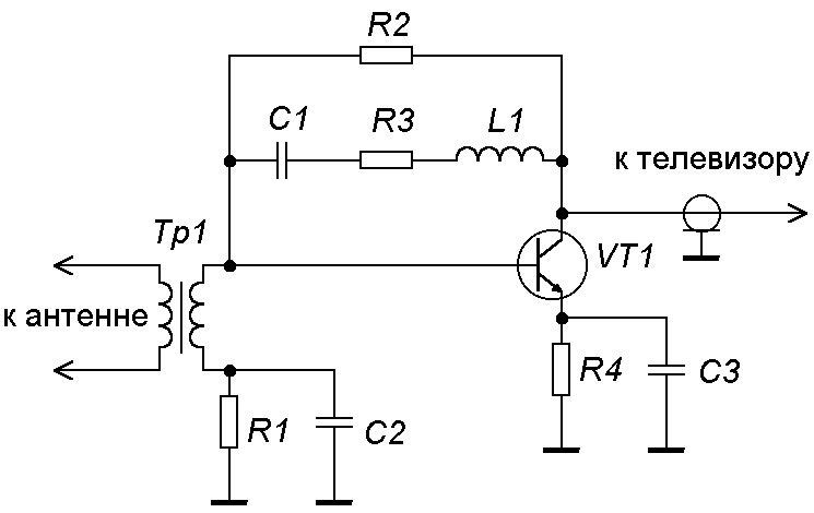 Точки возбуждения антенны подключаются непосредственно в балансное сечение трансформатора Тр1, который обеспечивает широкополосное согласование входа антенны с входом усилительного каскада. Усилительный элемент VT1 включен по схеме с общим эмиттером. Это позволяет реализовать большее полосовое усиление и лучшие шумовые свойства схемы сравнительно с другими вариантами включения. Эффекты влияния граничной частоты транзистора по крутизне на изменение коэффициента усиления и входного сопротивления в диапазоне рабочих частот компенсируются за счёт использования в схеме комбинированных частотно-зависимых обратных связей параллельного и последовательного типа. Параллельная обратная связь выполнена на элементах R3, C1, L1. Резистор R3 определяет согласование усилительного модуля в присоединительных стыках в метровом и нижней части дециметрового диапазона. В верхней части рабочего диапазона, где усиление спадает на 2-4 дБ, индуктивность L1 ослабляет действие этой обратной связи, выравнивая амплитудно-частотную характеристику (АЧХ). Конденсатор C1 обеспечивает развязку цепи обратной связи с контуром питания и одновременно формирует низкочастотный срез передаточной характеристики устройства. Цепь R4, C3 является элементом последовательной обратной связи по току, определяющей основные параметры каскада в малосигнальном режиме: резистор R4 задаёт номинальный коэффициент усиления каскада, а настройкой C3 регулируется подъём АЧХ в верхней части рабочего диапазона. Заданные параметры динамического диапазона обеспечиваются выбором типа транзистора и его режимом работы. В представленной схеме режим работы каскада по постоянному току задаётся R4 совместно с элементами базового делителя R1 и R2. Конденсатор С2 шунтирует R1 и обеспечивает асимметричность подключения Тр1 в схему модуля. Усилительный модуль, реализованный на среднемощном транзисторе третьего поколения, обеспечивает коэффициент усиления 15 дБ в полосе частот 40-800 МГц, коэффициент шума устройства не превышает 3,5 дБ, а динамический диапазон для телевизионных сигналов составляет 75 дБ. Снижение коэффициента шума и реализация большей линейности устройства возможны при использовании в схеме сложных активных элементов с каскодным включением либо при переходе к двухтранзисторным каскадам.