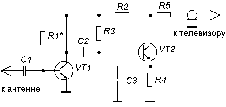 Усилитель в телевизионной приёмной антенне предназначен, главным образом, для увеличения чувствительности, ограниченную шумами, а во вторую очередь для компенсации потерь принимаемого сигнала в коаксиальном кабеле. Сами телевизоры обладают весьма большим запасом собственного усиления, т.е. имеют высокую чувствительность, ограниченную усилением. Несколько хуже у них чувствительность, ограниченная синхронизацией. И наконец, наиболее низкая – чувствительность, ограниченная шумами. Следовательно, фактором, определяющим дальний приём, следует принять уровень собственных шумов линейного тракта, а не коэффициент усиления.