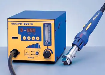 В HAKKO FR-803 применено микропроцессорное управление установкой и поддержанием основных технических параметров, цифровое управление и индикация температуры и времени. Также в ней имеются два режима работы: ручной - для простых операций и автоматический - для программного управления процессом монтажа и демонтажа. Регулятор воздушного потока имеет аналоговый индикатор. Кроме того, применен встроенный вакуумный захват компонентов, а также имеется регулятор вакуумного захвата. В станции выключатель работы и включения вакуума встроены в ручку паяльника. Управление вакуумным захватом и запуском работы может осуществляться ножным переключателем. В ней также существует функция энергосбережения.