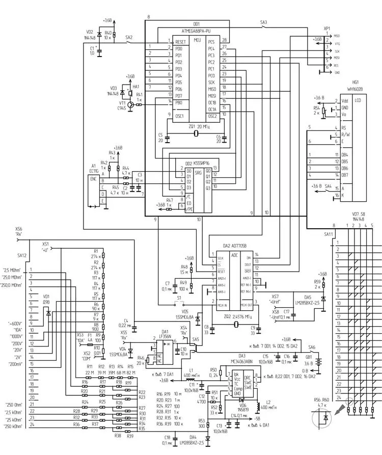 Схема мультиметра показана на рис. 1. Основой измерительной части мультиметра является АЦП DA2. Управление режимами его работы и обработка результатов преобразования производится микроконтроллером DD1 ATMEGA88PA-PU, связанный с АЦП DA2 интерфейсом SPI по сигналу готовности DRDY, поступающему на вывод 25 (PC2) микроконтроллера DD1. Микросхемы DA2 и DD1 используют один общий источник сигнала сброса при включении питания прибора. ИОН (2,5 В) для АЦП DA2 собран на микросхеме DA5. Источником тактовых импульсов для АЦП DA2 может служить собственный генератор АЦП DA2 при наличии кварцевого резонатора ZQ2 с частотой 2,4576 МГц или 1,0 МГц, или таймер 1 микроконтроллера DD1, генерирующий тактовые импульсы с частотой следования 1,0 МГц, подключаемый к выводу 2 DA2 перемычкой S1.
