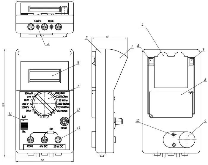 Конструкцию мультиметра поясняет рис. 2. Корпус мультиметра пластиковый G1189 производства GAINTA, и состоит из двух половин 1 и 2. На верхней половине 1 расположены дисплей 5, переключатель диапазонов 7, переключатель видов измерения 11, энкодер 12, и три гнезда 13, предназначенные для измерения сопротивления. На нижней половине спереди размещены гнезда "COM", "U" и "10 A". Также спереди расположены два гнезда 3 “+Uref” и “-Uref”, имеющие внутренний диаметр 2 мм, что позволяет использовать щупы импортных мультиметров для калибровки.