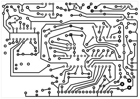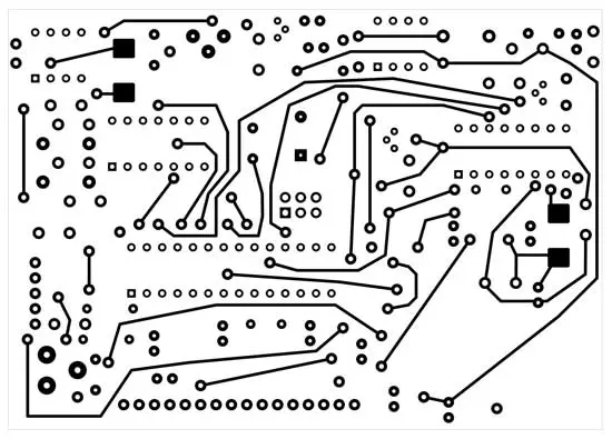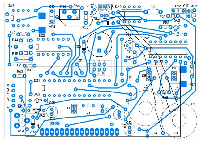 Большинство элементов смонтировано на печатной плате размерами 70×98 мм, рис 4. Расположение элементов на плате показано на рис. 3. Диоды VD7-VD58 и резисторы R56-R60 смонтированы на макетной печатной плате размерами 20×80 мм, имеющей металлизированные отверстия, расположенные с шагом 2,54 мм. Остальные элементы смонтированы навесным монтажом на выводах переключателей SA1, SA4, SA5, SA6, гнезд XS1…XS8, и держателя предохранителя FU1. Гнезда XS1-XS6 - гнездо приборное ГИ4. Гнезда XS7, XS8 изготовлены самостоятельно из латуни и имеют диаметр внутреннего отверстия 2 мм. Переключатели S1.1 и S1.2 - галеты переключателя 1Н-4.880.001 от приборов Ц4317, Ц4317М или приборов более ранних моделей. Переключатели SA2 и SA3 - DIP-переключатели DS1040-01RN, но можно применить выключатели ВДМ1-2 или аналогичные импортные. Выключатели SA4 и SA4 - серии SWR-45. Переключатель SA2 - ПДМ2-1. Постоянные резисторы - МЛТ или импортные типоразмера MFR3 производства TT-electronics, за исключением резистора R10 - проволочного шунта и подстроечного резистора R46 серии 3266 или 3296 фирмы Bourns и подстроечного резистора R54 серии 3306 фирмы Bourns. Допуск резисторов R11-R39 должен быть не хуже ±0,5 %. В приборе использован комплект резисторов делителя напряжения и шунт мультиметра DT830. Оксидные конденсаторы С1, С11, С13, С15 - импортные, остальные - К10-17, КМ. Акустический излучатель HA1 - Universal passive buzzer electromagnetic impedance 16 ohms AC / 2KHz 3V. Дроссели L1 и L2 имеют тороидальный магнитопровод DT60-52 размерами 15,2x8,53x5,94 мм. На нём намотаны 85 витков провода ПЭТВ-0,2.