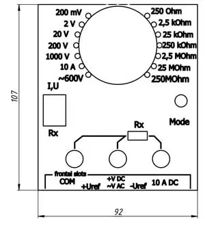В нижней половине снизу расположены батарейный отсек 4, выключатели питания и подсветки дисплея 6, лючок переключателя 8 и крышка держателя предохранителя 9, крепящаяся двумя винтами 10. Эскиз фальшпанели показан на рис. 5. Внешний вид мультиметра показан на рис. 6.
