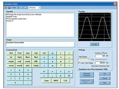 Наряду с созданием сигналов стандартных форм (все они были описаны выше) программа ArbExpress обеспечивает создание сигналов, временная зависимость которых задается математическим выражением. Для этого служит редактор математических формул, окно которого(рис. 11) вызывается активизацией гиперссылки Equation Editor... В окне редактора Equation можно составить простую программу, используя символы и функции, вводимые кнопками в окне Command List. Для примера показано создание сигнала, временная зависимость которого описывается квадратом синуса. Подготовленная программа (если она верна) компилируется без ошибок и в окне предварительного просмотра Preview можно наблюдать график созданной зависимости. Кнопка Send to Arb позволяет направить созданный сигнал в указанный канал генератора.