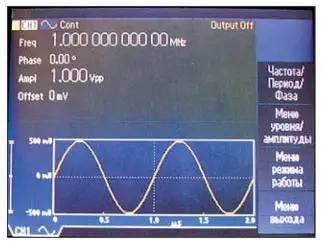 Генераторы имеют самый простой и наглядный интерфейс, подобный интерфейсу современных цифровых осциллографов. Большой жидкокристаллический цветной дисплей (только у модели AFG3021 он черно-белый) с размером по диагонали 5,6 дюйма отображает крупными знаками основные параметры сигналов и режимы работы генераторов и представляет форму создаваемых сигналов - рис. 2.