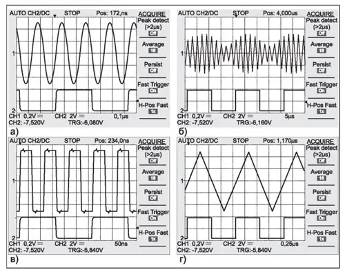Рис. 3. Осциллограммы сигналов на основном выходе (верхняя кривая) и выходе запуска (нижняя кривая): синусоидальный сигнал (а), синусоидальный сигнал с амплитудной модуляцией (б), прямоугольные импульсы (в) и пилообразный сигнал (г)