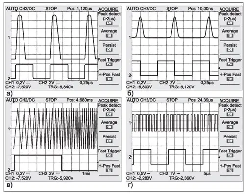 Рис. 4. Осциллограммы сигналов на основном выходе (верхняя кривая) и выходе запуска (нижняя кривая): импульсный сигнал (а), сигнал в виде функции Гаусса (б), частотно-модулированный сигнал (в) и импульсный сигнал с широтно-импульсной модуляцией