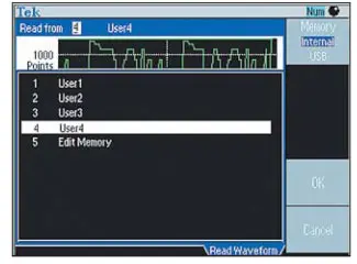 Для хранения созданных пользователем сигналов есть два вида памяти - встроенная и внешняя. Встроенная память позволяет создать 5 файлов, имена которых представлены в окне генератора, показанном на рис. 5. Это окно вызывается нажатием кнопки "Про-извольн. меню функций" и выбором позиции "Сигнал произвольн. формы экранного меню". В окне представлены имена файлов, хранящихся во внутренней памяти. В позиции экранного меню "Память" есть возможность выбора окон либо внутренней памяти (рис. 5), либо внешней памяти Flash-карты, которая вставляется в специальное гнездо.