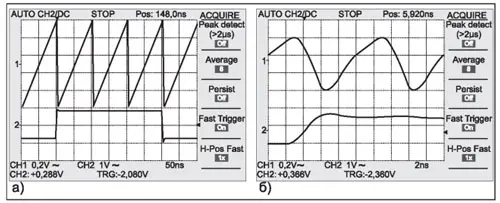 Рис. 6. Осциллограммы пилообразного сигнала на основном выходе (верхняя кривая) и выходе запуска (нижняя кривая) при частоте пилы 10 МГц (а) и 100 МГц (б)