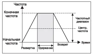 Для снятия АЧХ различных устройств и их испытания при изменении частоты сигналов служит режим "Качание" (кнопка "Sweep"). Важно отметить, что качание частоты может осуществляться как для синусоидального, так и для импульсного сигнала (как с применением внутреннего генератора развертки, так и внешнего). Зависимость частоты от времени представлена на рис. 7. Все указанные на этом рисунке временные и частотные параметры можно задавать в экранном меню. Кроме того, можно задать качание частоты по линейному или логарифмическому закону. Последнее нужно при снятии логарифмических АЧХ - ЛАЧХ.