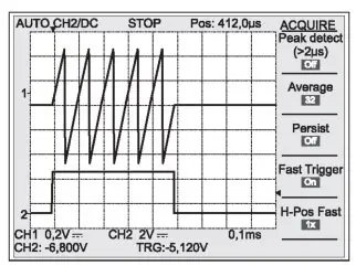 Стоит остановиться на еще одной интересной возможности приборов - формировании пачек сигналов различной формы. Для задания такого режима работы служит кнопка "Пачка". Можно изменять число сигналов в пачке. Возможна также непрерывная генерация заданной пачки. На рис. 8 показан пример генерации пачки из 5 пилообразных импульсов. Пачка может стробироваться как от внутреннего генератора импульсов, что и показано на рис. 20, так и от внешнего генератора, выход которого подключается ко входу Input на передней панели генератора AFG3000.