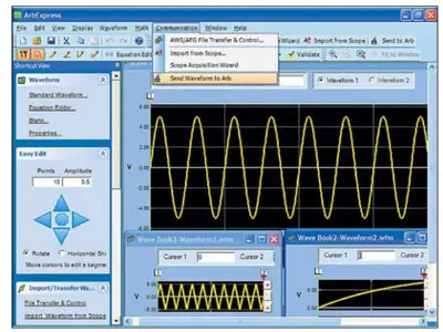 На рис. 9 представлено окно программы ArbExpress с тремя окнами различных сигналов. Они создаются после активизации гиперссылки "Standart Waveform." в окне Waveform в левой части рис. 9. Команда "Send Waveform to Arb" в позиции меню "Communication" обеспечивает передачу установок выбранного сигнала (из текущего окна) в генератор AFG3000.