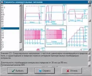 Список стандартных элементов измерительного сигнала (библиотека стандартных сигналов), из которого осуществляется вставка элементов в строку, изображен на рис. 4. Для удобства выбора, кроме названия элемента, имеется его изображение, описание по ГОСТу и перечень параметров.
