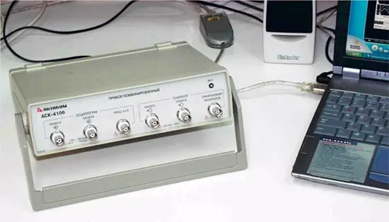 Итак, комбинированный прибор АСК-4106 (рис. 1): осциллограф + генератор сигналов. Конечно, АСК-4106 сохраняет все возможности двух его предшественников: АСК-3106 (цифровой запоминающий осциллограф) и АНР-3121 (генератор сигналов произвольной формы), но, кроме того, он может использоваться и в качестве универсального измерительного комплекса. Совмещая под единым управлением компьютерной программы источник испытательных сигналов и прибор для их измерения, АСК-4106 позволяет в автоматическом режиме измерять амплитудно-частотные, амплитудные, фазо-частотные и переходные характеристики испытываемого устройства.