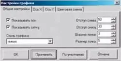 Для всех графиков реализована возможность курсорных измерений. Для каждого графика пользователь может установить наиболее удобные настройки с помощью специального диалогового окна (рис. 10). Здесь можно выбрать наиболее подходящие цвета для всех элементов графика, настроить стиль графиков, установить параметры осей (масштаб, шаг сетки, линейная или логарифмическая). Каждый график настраивается независимо.