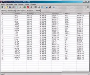 Просмотреть исходные данные для построения графических характеристик в числовом виде можно в таблице на вкладке "Сводка" (рис. 11). Для каждой точки измерений в эту таблицу построчно заносятся: "N" - номер точки измерений, "Частота ->" - заданная частота ИС, "Амплитуда ->" - заданная пиковая амплитуда ИС, "СКЗ ->" - измеренное среднеквадратическое значение амплитуды входного сигнала, "Частота <-" - измеренное значение частоты выходного сигнала, "Фаза <-" - угол сдвига фазы выходного сигнала относительно входного, "СКЗ <-" - измеренное среднеквадратическое значение амплитуды выходного сигнала.