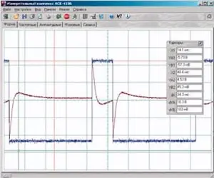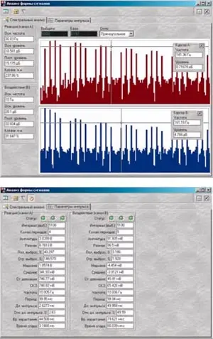 Для изучения переходных характеристик испытываемых устройств пользователь может либо просто воспользоваться курсорными измерениями на графике формы сигналов либо дополнительно использовать возможности автоматических измерений модуля анализа формы сигнала (рис. 12). Этот модуль объединяет возможности спектрального анализа (разложение сигналов в гармонические ряды, изображение спектров сигналов и их параметров: частот и амплитуд гармоник, коэффициента нелинейных искажений) и алгоритмов автоматического определения параметров импульса (частоты, длины импульса, времени нарастания и спада, величины выброса и т. д.).